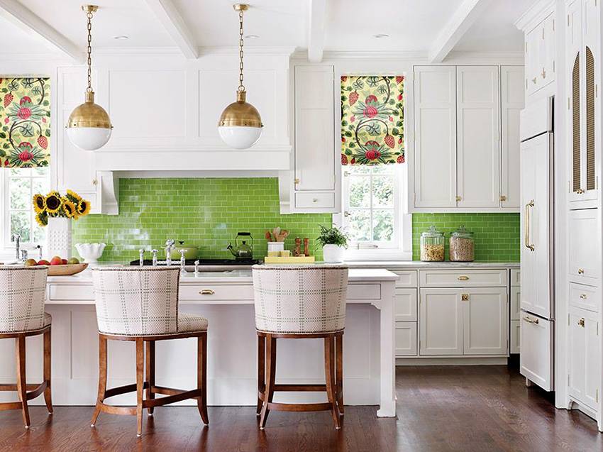 - Кантри. В этом случае рекомендуются более яркие лазурные цвета, которые используются для отделки фартука, а также других поверхностей. Хорошо в таком интерьере комбинировать бело-зеленые и даже черно-белые оттенки.