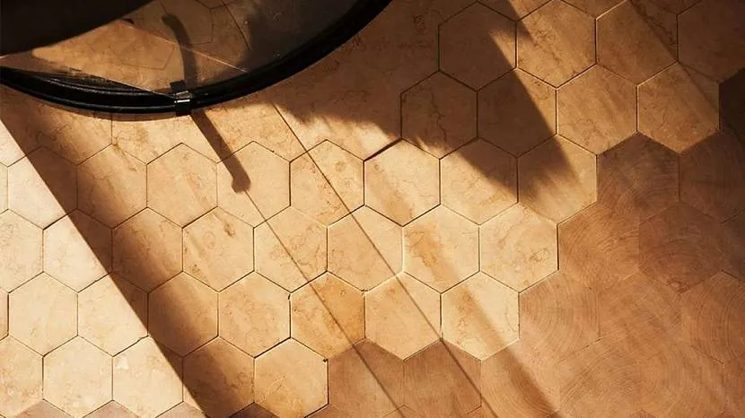 Необычное решение для зонирования пространства небольшой кухни: комбинирование белой шестиугольной плитки и ламината