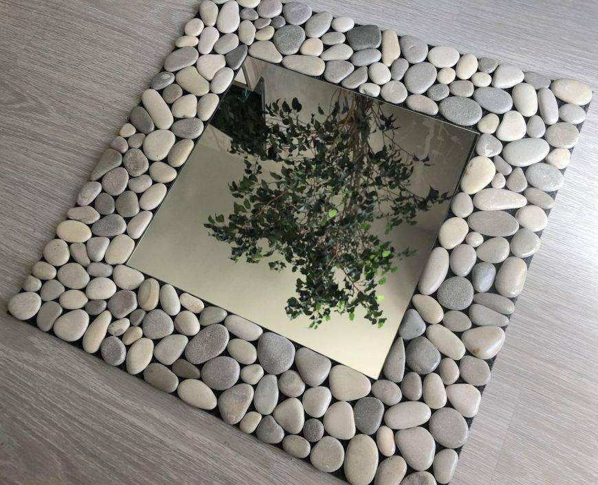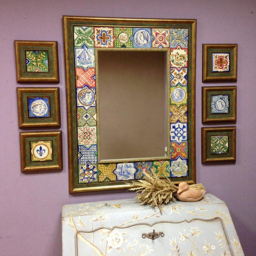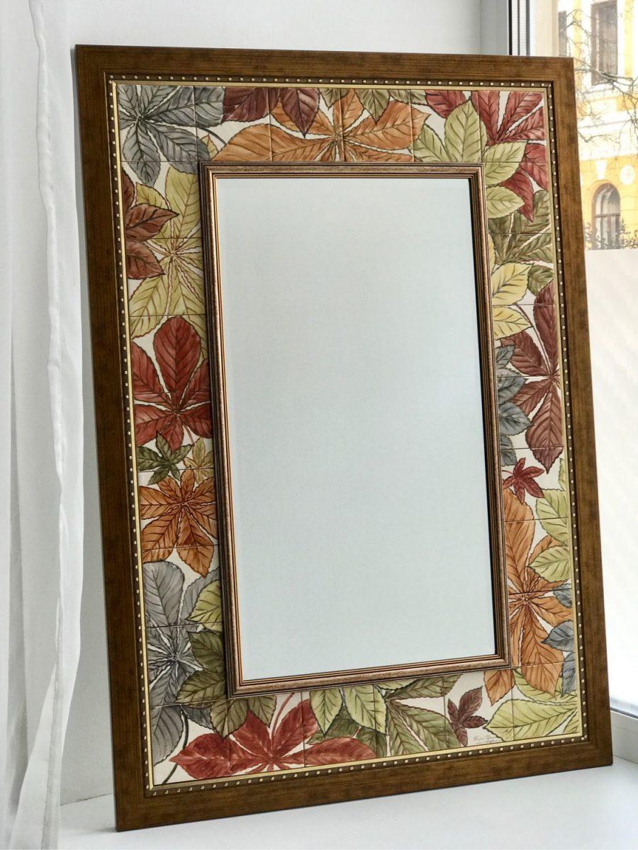 Менее привычный материал для оправы, но точно стоящий внимания — керамическая плитка. Она позволяет создавать как нежнейшие, так и брутальные композиции абсолютно под любой интерьер.