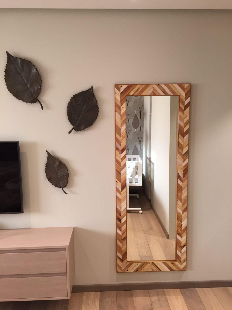 Оригинальный, хоть и более затратный способ оформления рамы для декора из зеркал на стене — деревянные линейки. Расход зависит от размера зеркального полотна, но необходимо учитывать, что подобное украшение лучше всего смотрится на большом формате. Хороший вид будет как у новых, так и у старых линеек.
