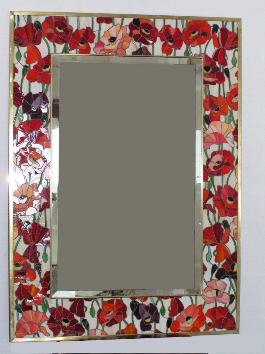 Декоративная роспись витражными красками Источник my-art.at.ua Промышленное декорирование включает технику пескоструйной обработки (абразивно-струйной гравировки), травление амальгамы изделия с последующим окрашиванием, различные виды витражей (классический, фьюзинг, пескоструйный). Если зеркало украшено пескоструйным напылением, возможно, его удастся скомбинировать с ручной росписью.