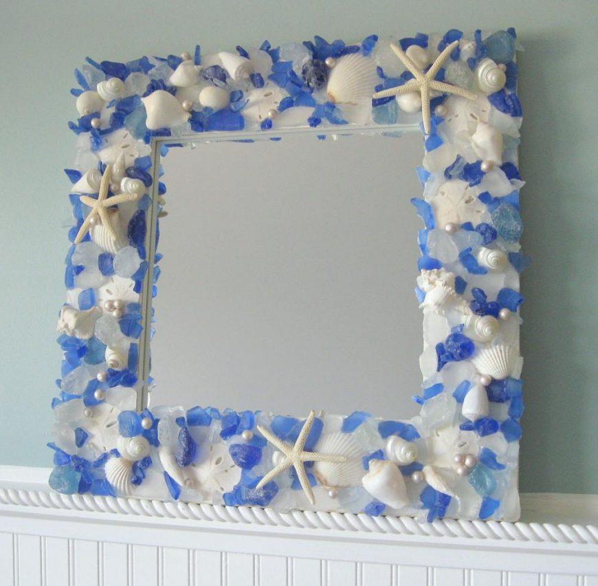 Красивое оформление получается из стеклянных шариков марблс, популярной детской забавы во многих странах мира. Производители выпускают шарики всех цветов радуги, прозрачные, матовые, перламутровые, с разводами; встречаются плоские, овальные и фигурные варианты. Шарики подходят в качестве декора зеркала в ванной, но основу для них (из-за веса) надо делать особенно прочной.