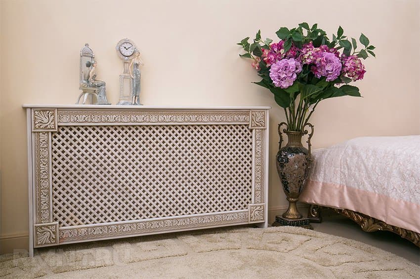 Ручная работа мастеров-краснодеревщиков также высоко ценится, поэтому деревянные декоративные решетки на радиаторы отопления являются дорогим удовольствием. Однако выдержать строгость классического стиля или изящную простоту стиля кантри без таких элегантных конструкций невозможно. Отлично смотрятся плетеные декоративные решетки, которые хорошо гнутся, поэтому подходят для придания экранам криволинейных форм.