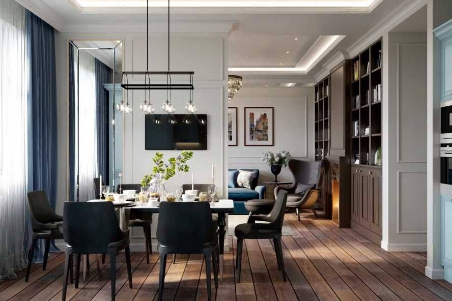 На кухне гипсокартонные перегородки делаются в виде барных стоек, которые соединяют кухонную и обеденную зоны.
