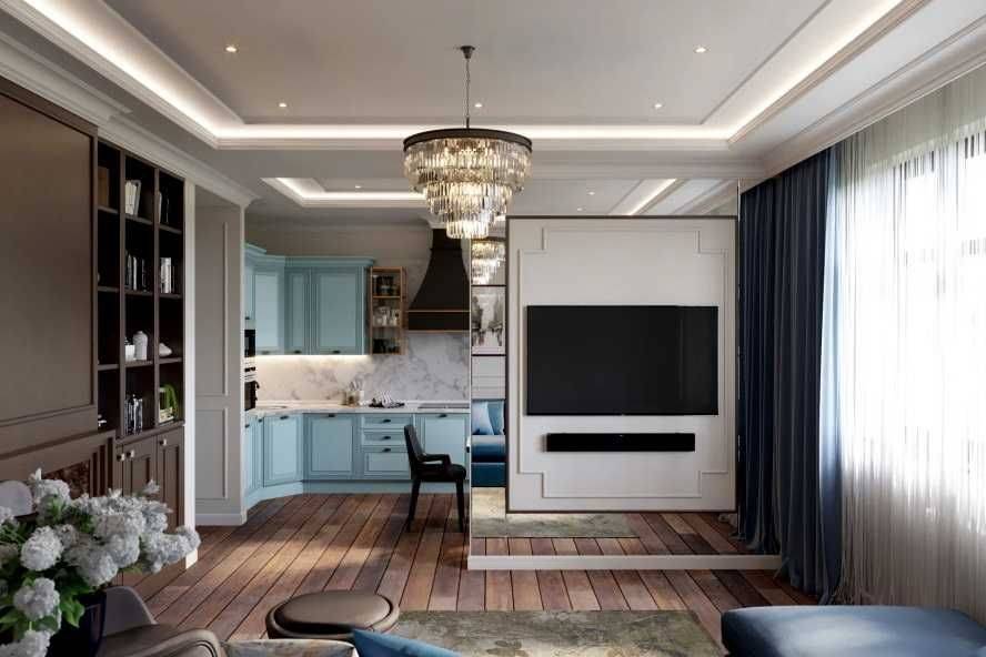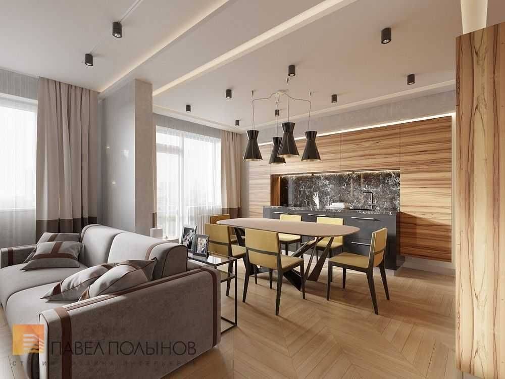 В данном случае возведена небольшая зонирующая конструкция возле стены с окнами. Она подчёркивает условную линию разграничения между кухней и гостиной. Дизайнер применил также потолочное зонирование: в потолок встроена линейная подсветка, явно указывающая на границу.