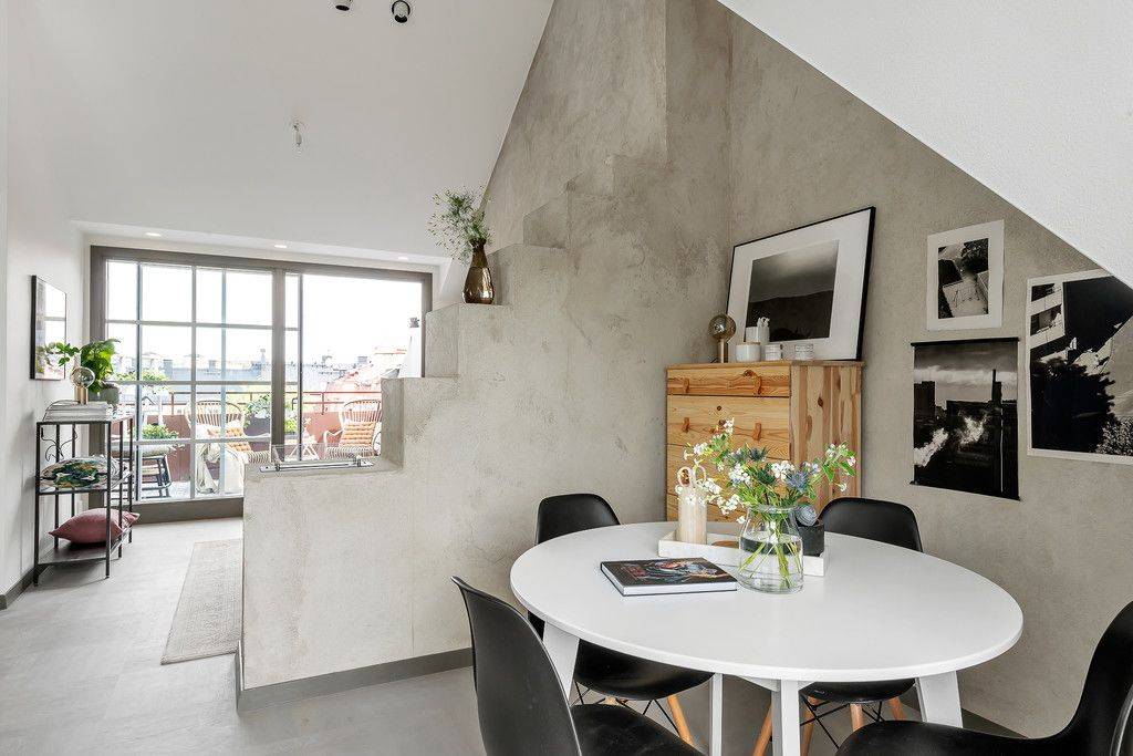 Декоративная бетонная перегородка в стиле лофт имеет ступенчатую форму и является границей между гостиной и столовой