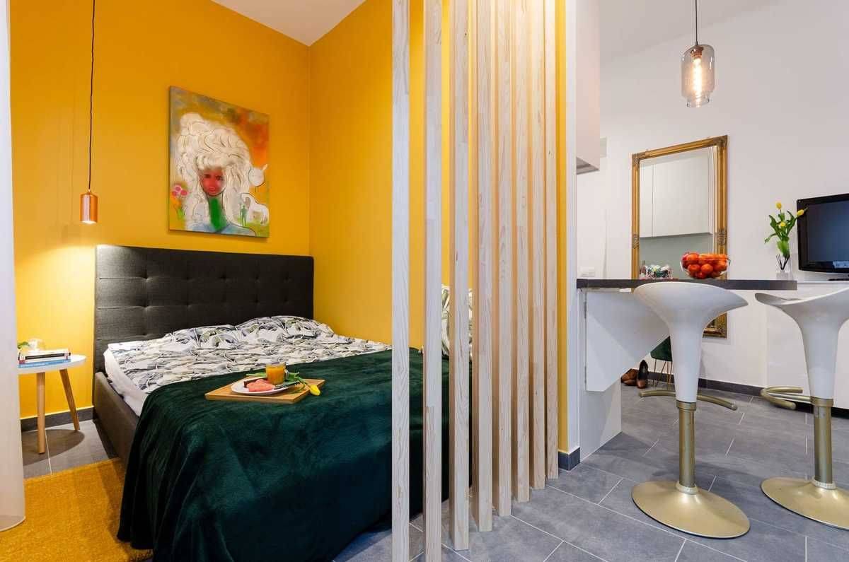 Место для отдыха располагается в углу комнаты и отгораживается ширмой или шторой. Перегородка разделяет комнату на две равные зоны: спальное помещение и гостевое.