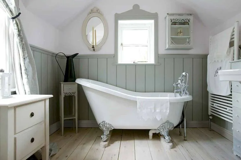 Вместо керамической плитки стены здесь стоит оклеить декоративным камнем – ее имитацией. Поскольку ванные, как правило, довольно маленькие, выбирают светлые оттенки и устанавливают светильники вверху, внизу и посередине, чтобы комната не казалась склепом.