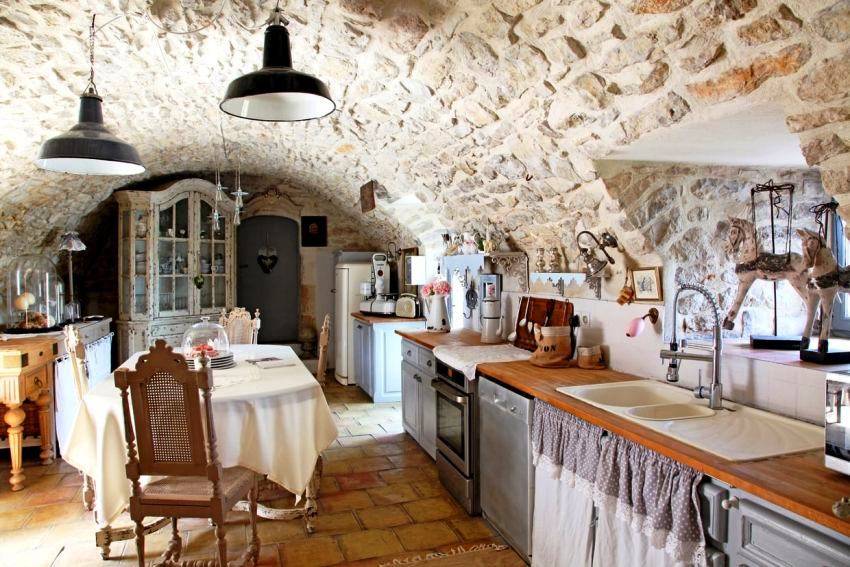 На фото сводчатый потолок с каменной декоративной облицовкой в интерьере небольшой кухни.