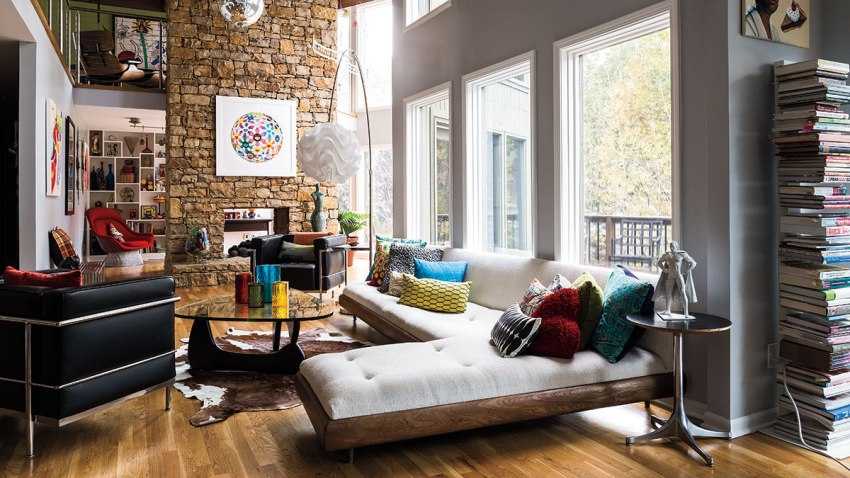 Оживить интерьер просторной комнаты с высокими потолками могут сочетания оранжевого с синим, желтого с фиолетовым и т.п. Яркие однотонные стены не будут скучными, если правильно расставить акценты, то есть добавить элементы из декоративного камня.