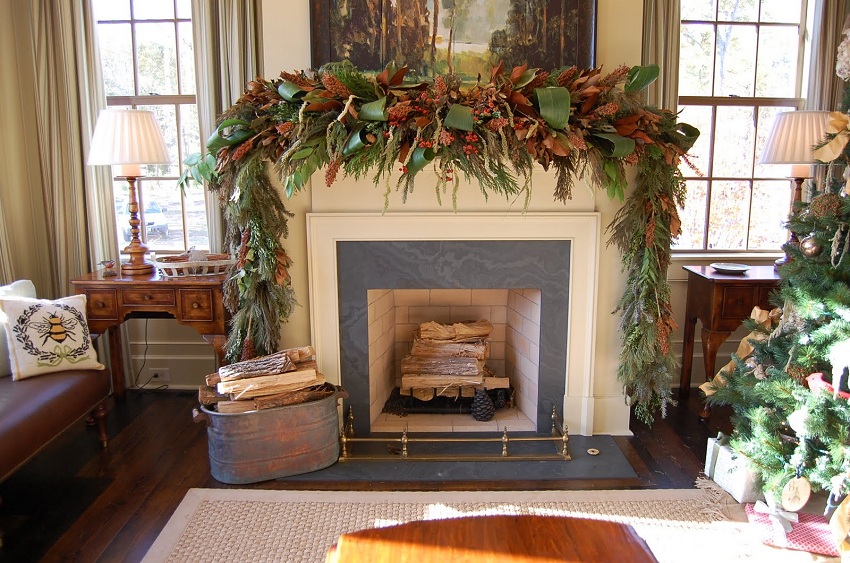 У настоящего камина не ставят цветы, ведь им там будет жарко. А декоративный камин можно украшать настоящими цветами, еловыми ветками и растениями в горшках.