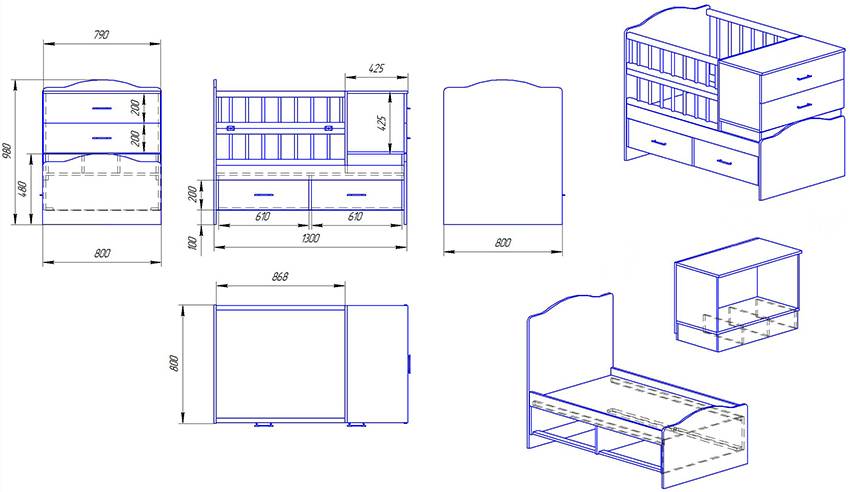 Сегодня в интернете встречаются подробные чертежи с размерами различных вариантов конструкций детских кроватей. Обладая минимальными навыками и имея большое желание порадовать своего ребенка, можно своими руками создать уникальное спальное ложе.