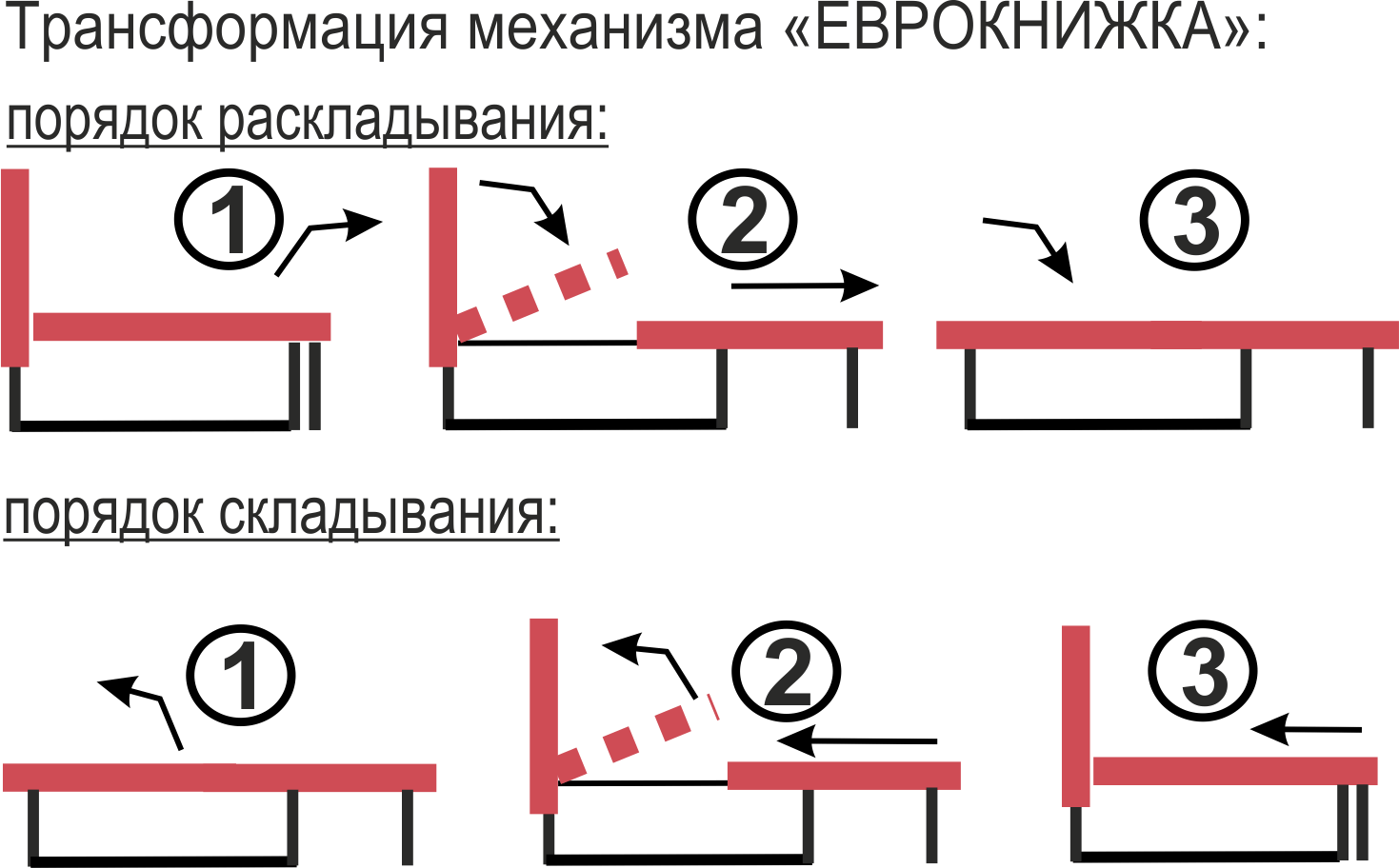 Евро- отличается от механизма трансформации дивана «Книжка». Скорее, это модифицированная софа, чем привычный с советских времен диван. Одно из важных преимуществ модели — простота перевода из «сидячего» положения в «лежачее». Процесс по силам человеку любого возраста и физических возможностей, так как «Еврокнижка» раскладывается по простой схеме: