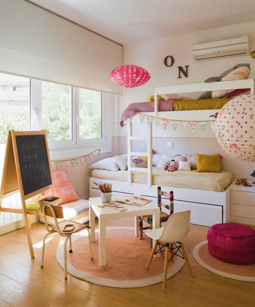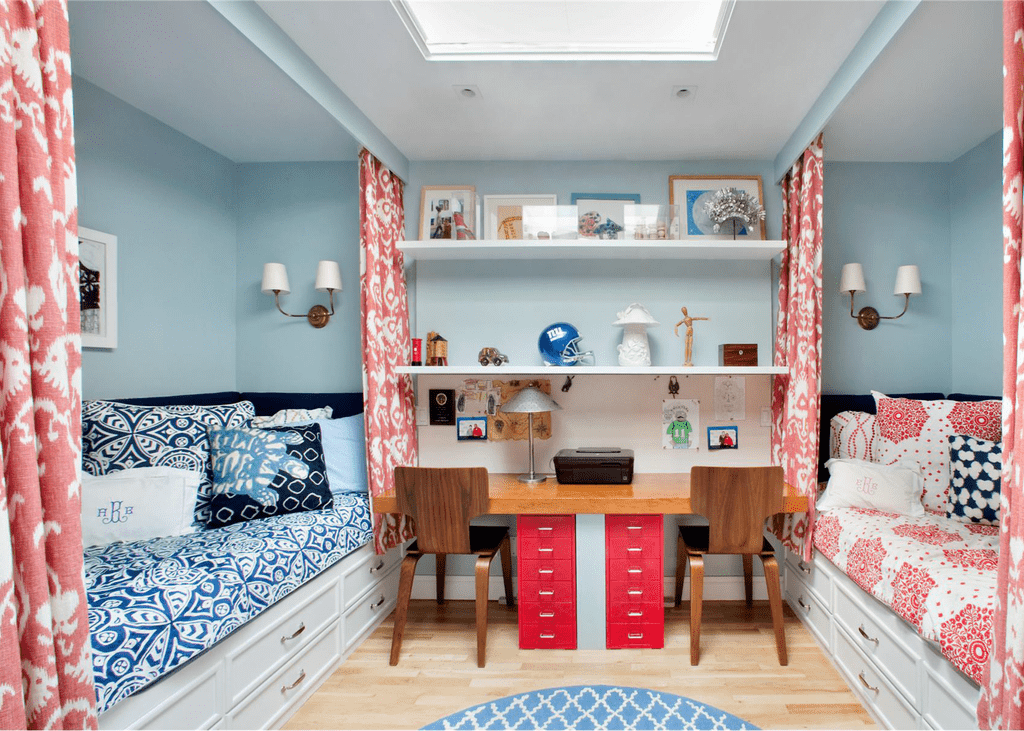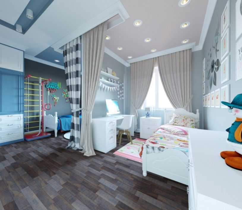 Когда в комнате проживает 2 разнополых ребенка, лучше прибегнуть к приему зонирования, чем делать строгое разделение. Так можно будет обеспечить отдельную игровую зону, личное пространство, в котором имеется свое спальное место, и рабочую область. При этом не придется обустраивать дополнительные перегородки, уменьшая и без того малое пространство.