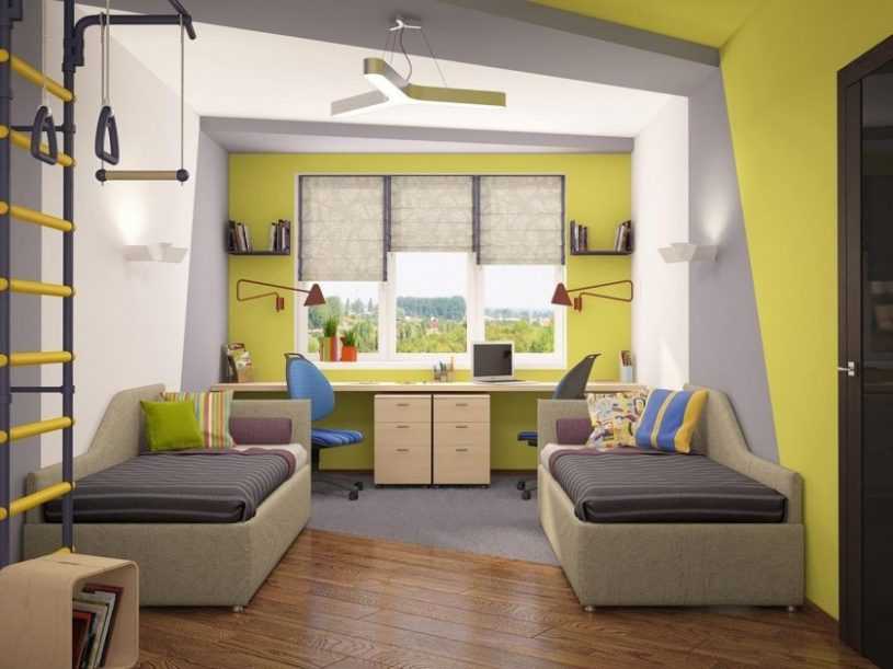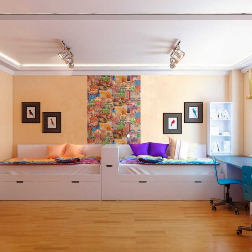 Дизайн детской комнаты для двоих детей подростков создается в нейтральной палитре. Для разнополых детей желательно отделять зоны ширмами или занавесками, а если площадь позволяет, то лучше использовать высокие шкафы. Так каждый ребенок ощутит больший уют, получив свое личное пространство. Декор помещения лучше доверить самим подросткам.