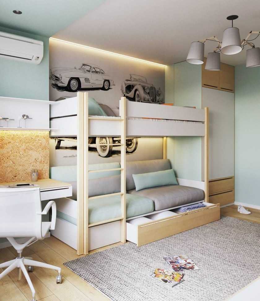 Настоящим спасением станет трансформирующаяся мебель, которая поможет стильно и функционально наполнить интерьер любой маленькой детской. Рассмотри модели кроватей, которые в сложенном состоянии прячутся в шкаф или превращаются в стол. Сейчас на мебельном рынке можно найти все что угодно или сделать под заказ.