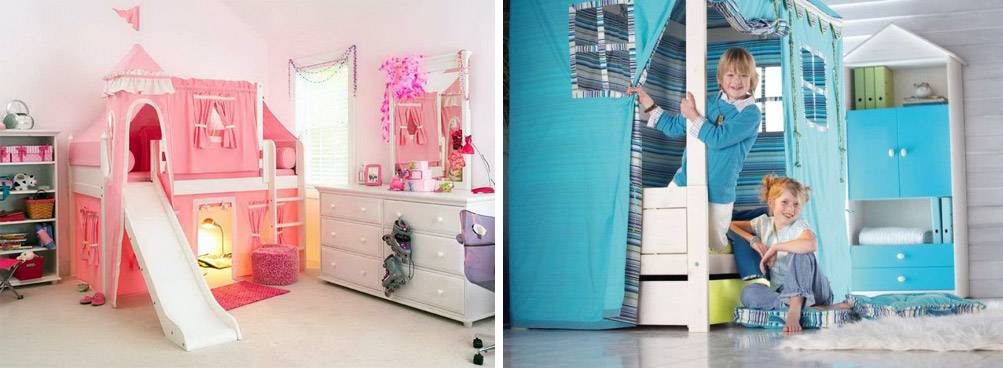 Детские комнаты с домиками для игр. Справа — компромиссный вариант для двоих детей разного пола