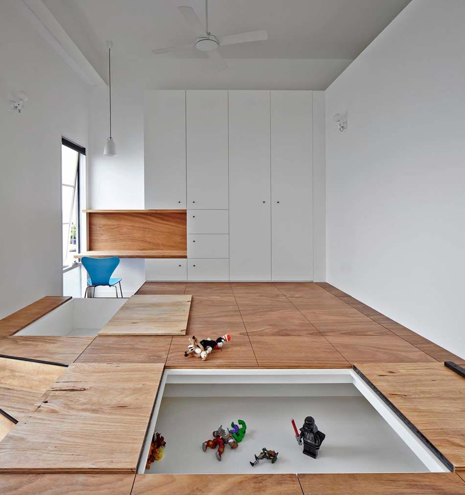 Сбоку кровать превращена в систему хранения. Практичный вариант