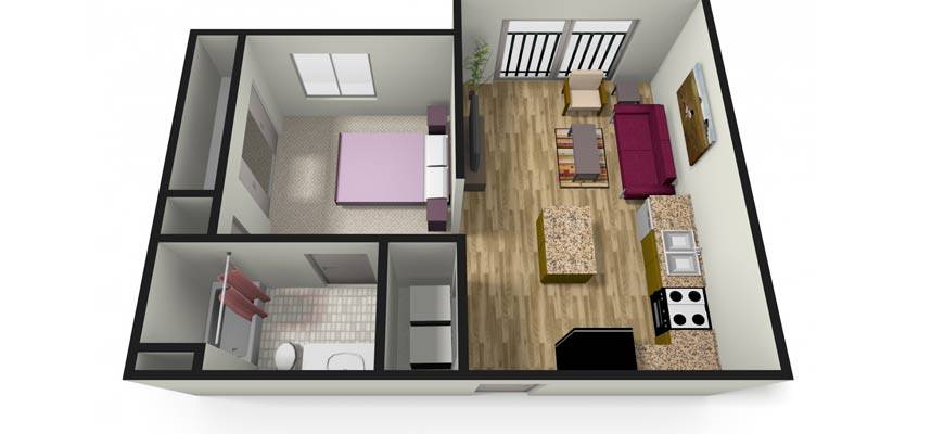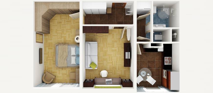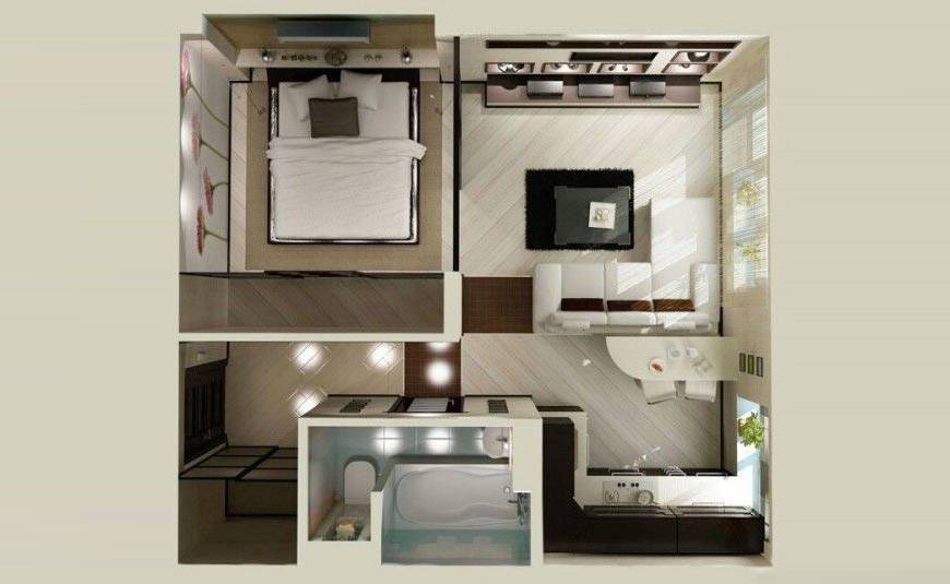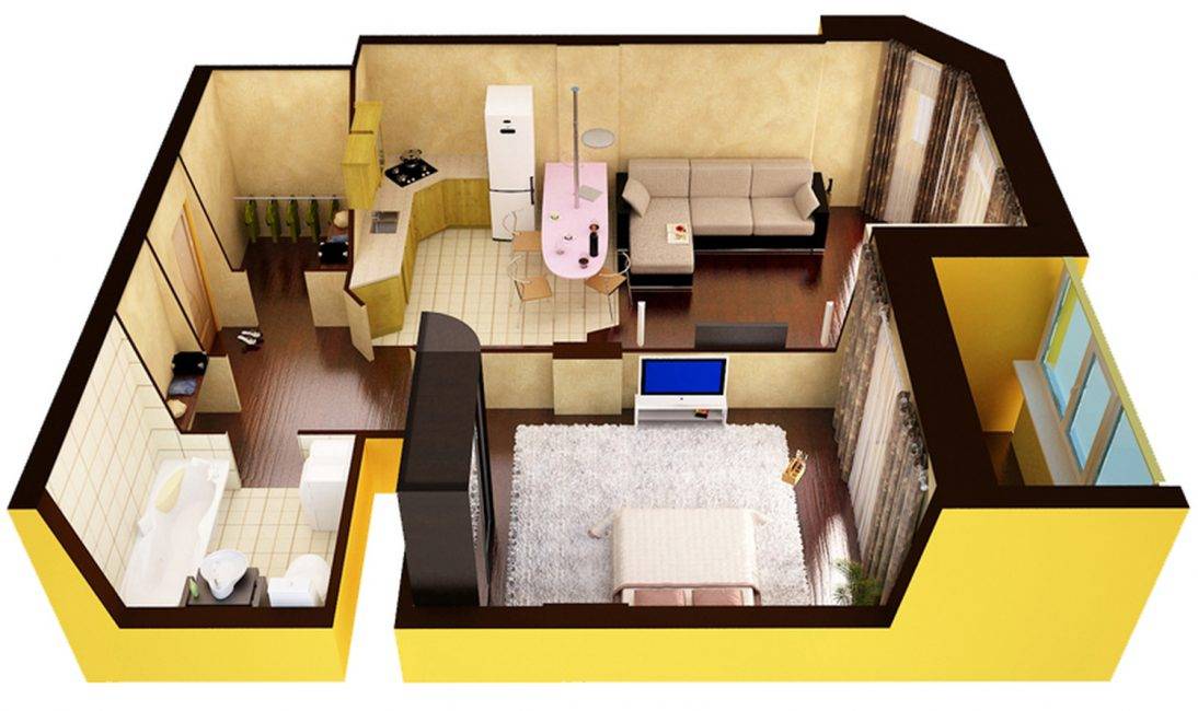 Площадь такой квартиры не большая. Планировка позволяет выделить отдельную спальню и совместить кухню с гостиной. Санузел в такой квартире совмещенный. Подобное жилье подходит для небольших семей.