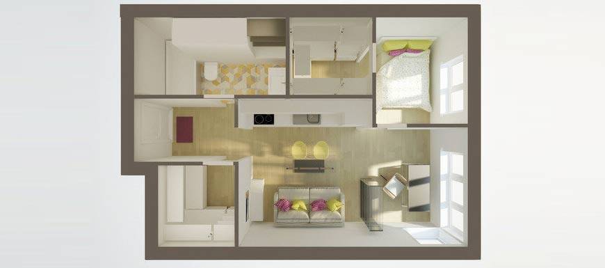 Его общая площадь составляет 41 квадратный метр. Помещение разделено на две смежные комнаты, небольшую кухню, санузел. Это самый проблемный проект не только для жизни людей, но и для перепланировки. Чтобы утеплить спальню и гостиную, вам потребуется значительно уменьшить их размеры.