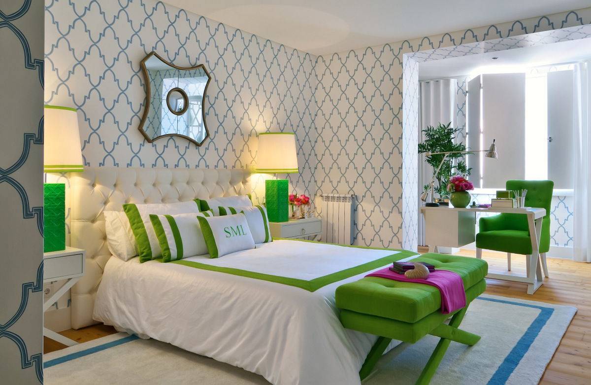 Геометрические узоры также отлично подходят – вертикальные полосы поднимают потолок, а горизонтальные делают спальню шире.