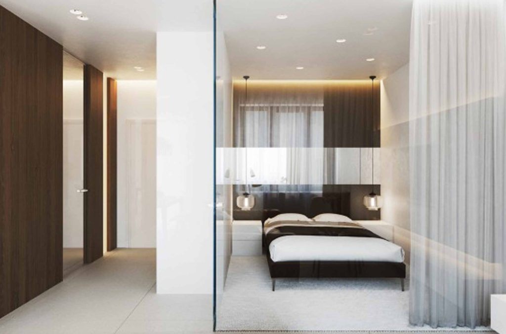 Минимализм разработан специально для организации данного вида спален. Главные аспекты – легкость, воздушность свободного пространства. Характерна низкая мебель, шкафы-купе, точечные светильники и натуральные материалы отделки.