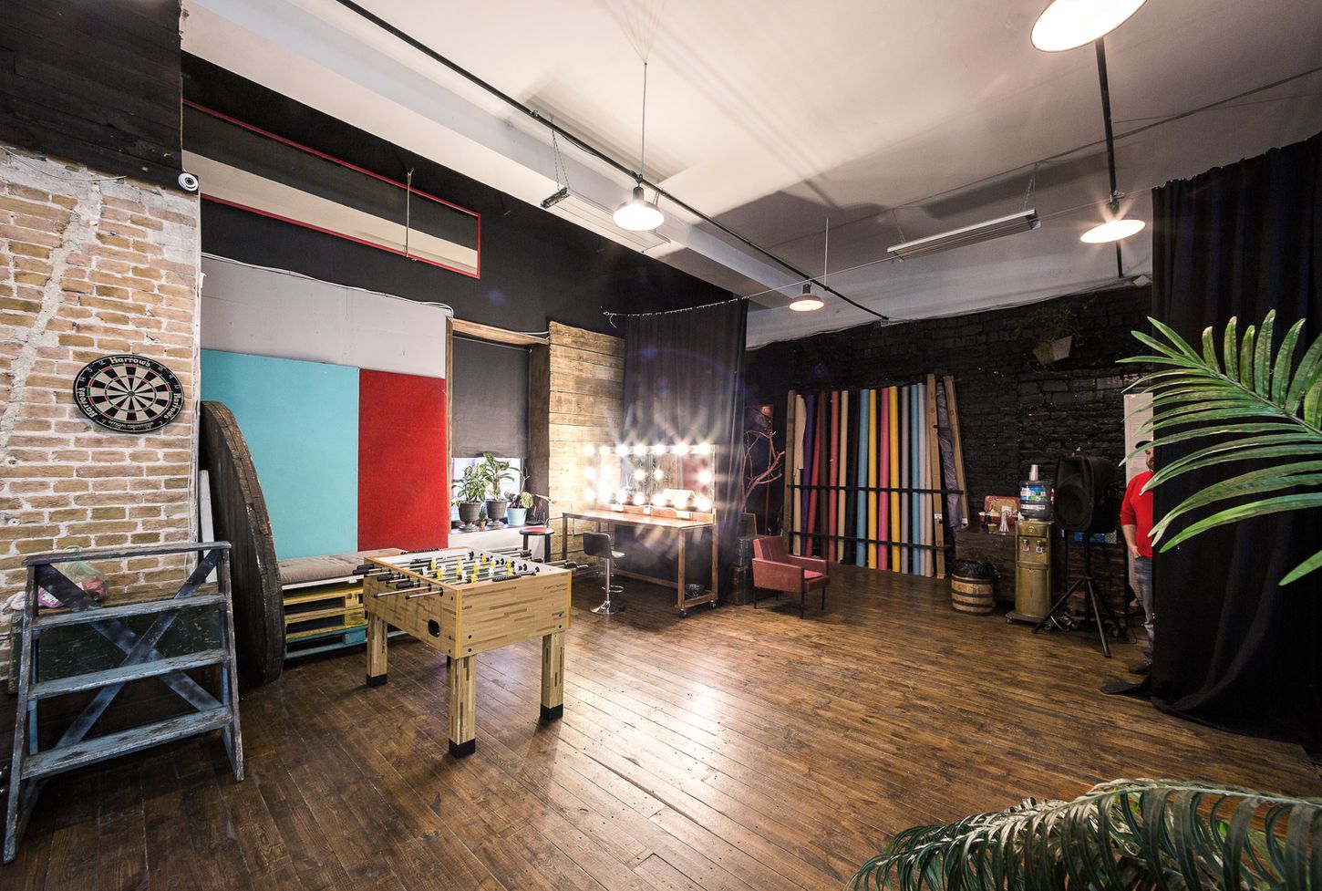 В индустриальном стиле используют серый, коричневый, ржавый, серебристый, черный, белый цвета. Для маленькой квартиры-студии подойдут только светлые оттенки. Выгодно смотрятся сочетания контрастных тонов.