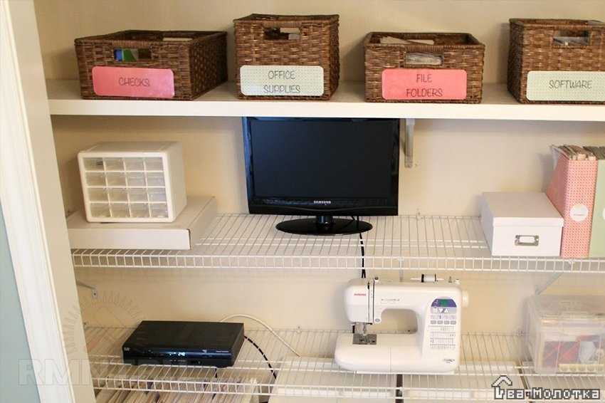 Такая кладовка используется для хранения инструментов, размещения рабочего стола с различными приспособлениями. Можно отвести помещение под швейную мастерскую. В этом случае здесь будет располагаться стол со швейной машинкой и все необходимые для рукоделия мелочи.