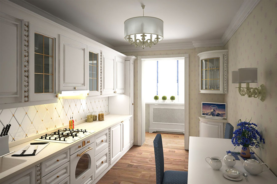 Выбирая классику, закажите резные фасады для кухни, имитирующие природное дерево. Классический стиль приветствует красивое и богатое оформление окон, жалюзи не приветствуются. Пусть балконные обширные окна закрывают тюль и шторы, не пропускающие свет. Каждый предмет интерьера должен быть добротным и иметь натуральные цвета и оттенки. Стиль негативно принимает новомодную бытовую технику, поэтому микроволновые печи, мультиварки и прочее должны быть максимально спрятаны за дверцами шкафов. Освещение может быть различным по яркости, но светильники и потолочные люстры в классике – это закон.
