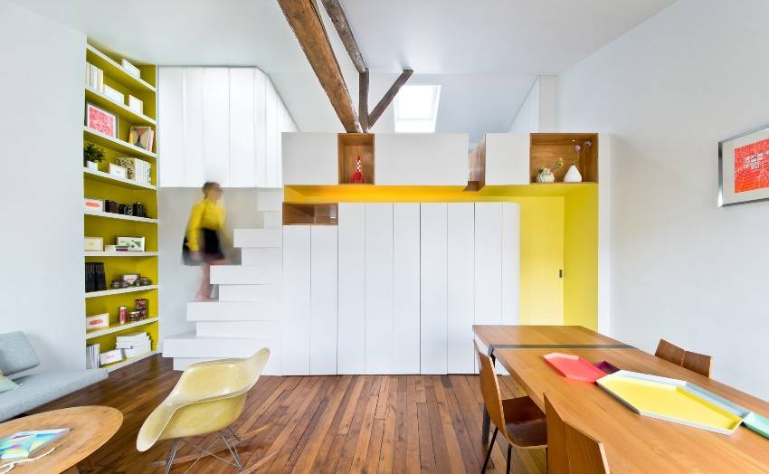 Как уже упоминалось, разделение квартиры на различные зоны можно выполнить при помощи освещения, ширм, невысоких перегородок, предметов мебели, потолка или напольного покрытия. Наличие мебели сводится к необходимому минимуму, а места для хранения можно обустроить в нишевых шкафах-купе и ящиках, скрытых в подиумах.