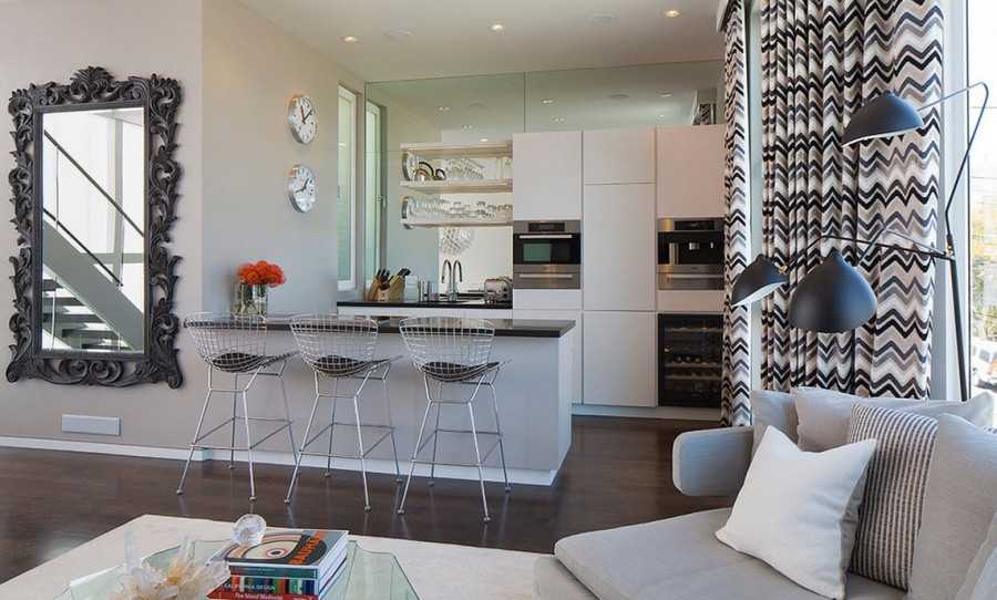 То же самое можно сделать с помощью шкафа-купе. А кухонную зону можно обозначить с помощью барной стойки, располагающейся в виде буквы Г.