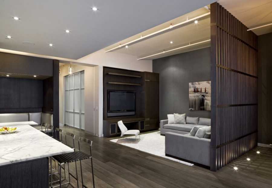 Так, например, посредством складной ширмы или большого аквариума можно отделить спальное место, а при помощи барной стойки эффектно отделяется кухня от остальной квартиры. Даже мягкий уголок или журнальный столик могут стать хорошим разделителем зон.