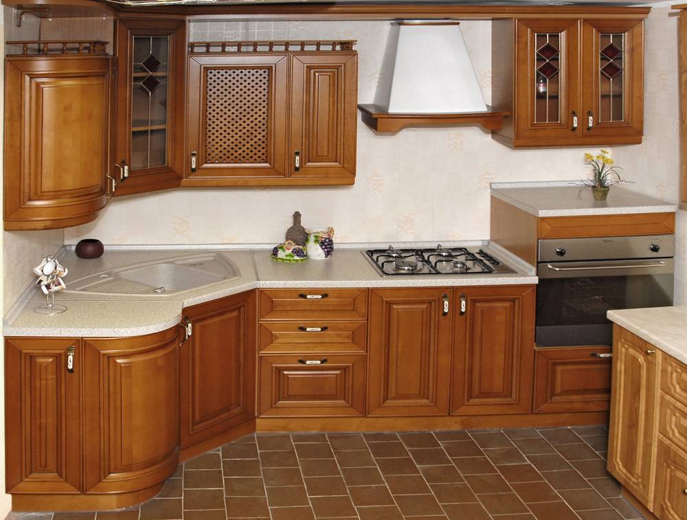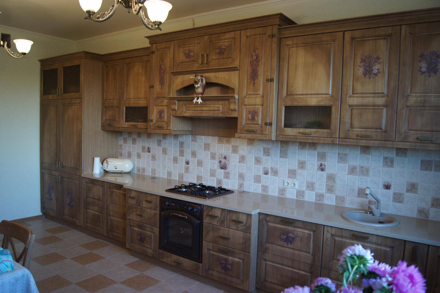 - Центральным элементов на кухне является гарнитур, который должен быть сделан из дерева твердых пород.