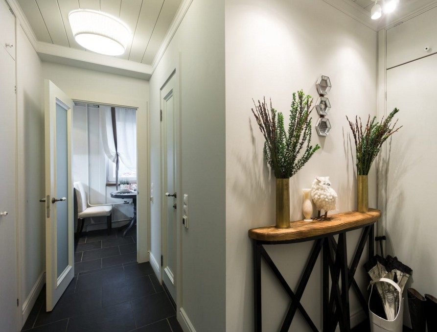 Над зеркалом важно создать яркий свет, который, отражаясь в нем, будет рассеиваться по всему холлу в хрущевке. Фото реального дизайна прихожих в хрущевке наглядно отображают разные варианты освещения