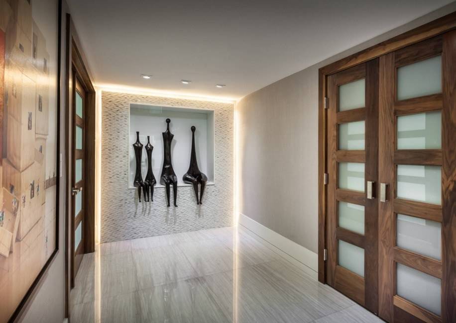 Для зрительного увеличения высоты помещения рекомендуется по контуру осветить потолок с помощью светодиодной подсветки и расположить на нем на одинаковом расстоянии друг от друга 2-3 потолочные люстры. Визуально расширить общее пространство также поможет светодиодная подсветка, размещенная по периметру пола, что показано на фото небольших прихожих.
