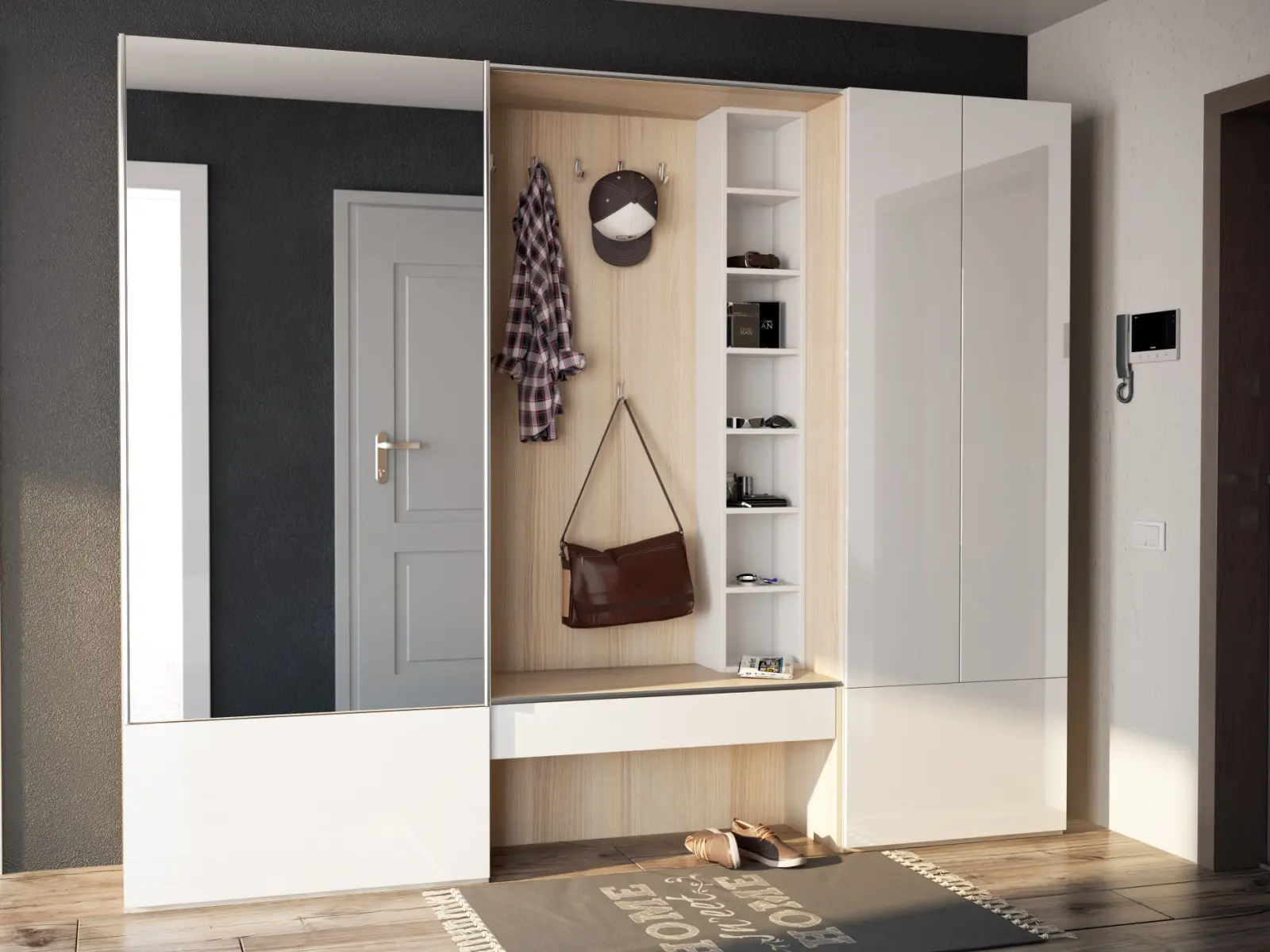 Состав предметов мебели зависит от габаритов и конфигурации прихожей. К примеру, в однокомнатных квартирах, расположенных в старых домах, встречаются очень маленькие прихожие, имеющие при этом нишу. В последней можно поместить шкаф до потолка, который будет служить местом хранения обуви и других вещей.