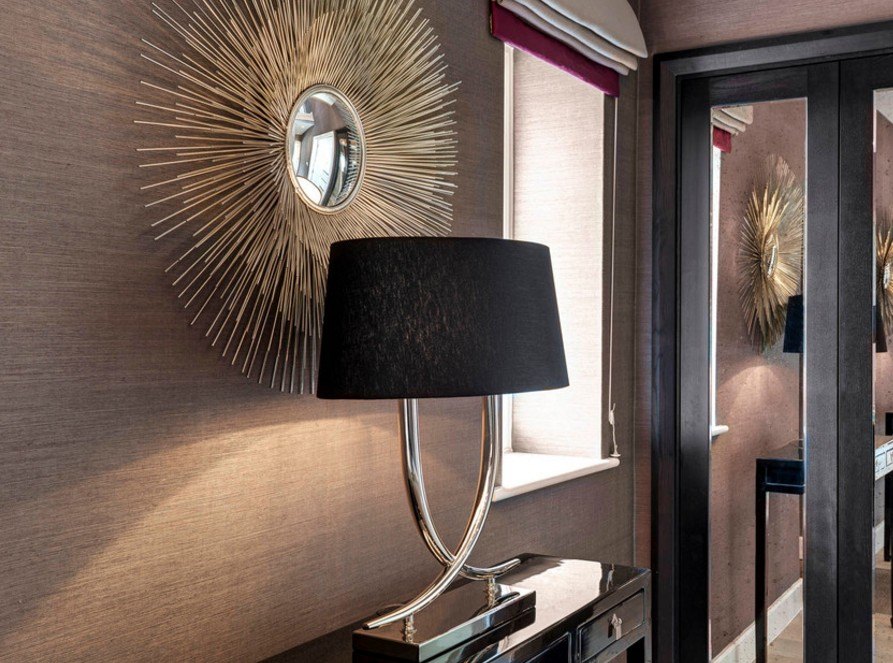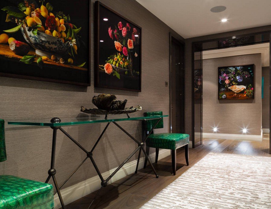 Если есть желание подчеркнуть какую-то деталь в интерьере прихожей, можно воспользоваться для этого светильниками. Например, в варианте ниже размещенные на стене светильники выгодно подсвечивают мозаику с зеркальной поверхностью на противоположной стене, создавая невероятно богатый и привлекательный эффект.