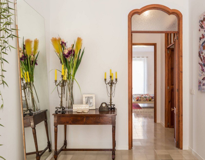 В пастельной прихожей света и пространства добавит глянцевый натяжной потолок, или потолок из зеркальных плиток. Будет органично смотреться узкая консоль с ящичками на гнутых ножках. Главное – не переборщить с изогнутыми линиями. В пастельном интерьере достаточно намёка в виде настенных светильников с подвесками.