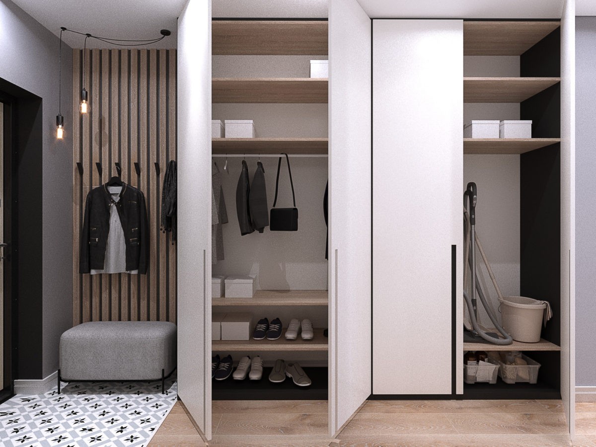 Если прихожая тесная и в ней сложно выделить место под шкаф для хранения одежды, лучше выбрать открытые вешалки: в этом случае «съедается» меньше пространства. Если же габариты помещения позволяют установить в нём шкаф для верхней одежды, тогда без открытых вешалок можно обойтись.