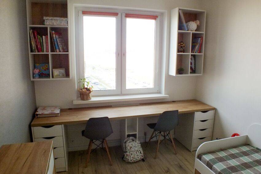 В удлиненном пространстве обычно возникают проблемы с установкой рабочего места или туалетного столика. Эта мебель размещается рядом с оконным проемом, подоконник можно переоборудовать под столешницу с применением принципа зонирования.