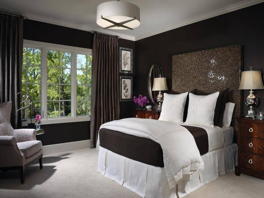 К мебели шоколадного оттенка можно подобрать текстиль жёлтого или салатового цвета. Теплая цветовая гамма наполнит комнату гармонией и уютом. Чем насыщеннее оттенок, тем меньше его должно быть в оформлении спальни-гостиной.