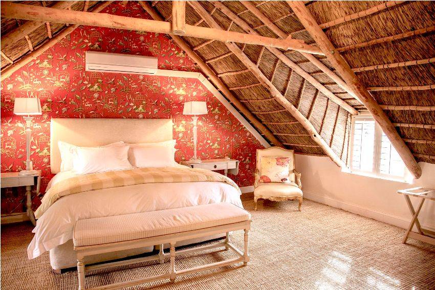 Интересный дизайн мансардной спальни с использованием обоев с шелкографией и бамбуковых палочек