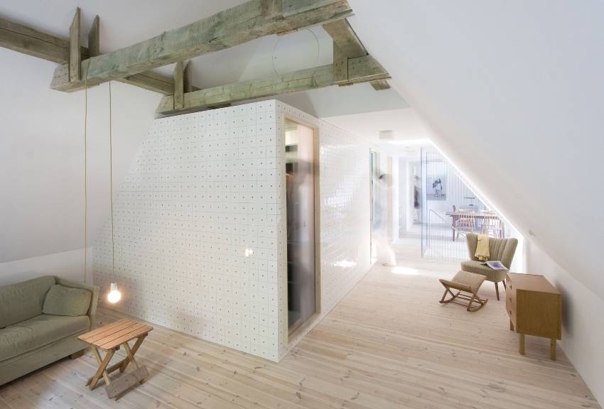 И даже открытые элементы, которые нередко остаются в дачных мансардах, можно вот так эффектно подчеркнуть в модном шведском стиле. Изучите внимательно эту иллюстрацию: всего лишь белые, с легким оттенком стены и пол, подкрашенные морилкой открытые деревянные элементы стропильной системы, минимум мебели и пару красных акцентов в мебели. А как шикарно смотрится: