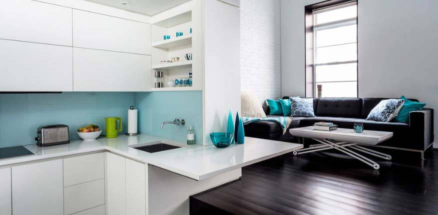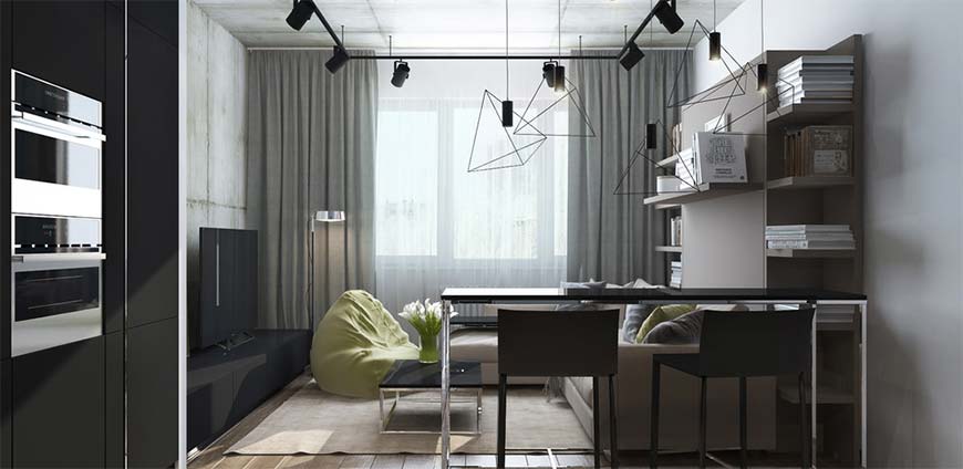 Начнём с обеденной зоны. Вы можете сделать её с помощью барной стойки, которая визуально разделяет комнату. Трансформирующийся стол отлично подойдёт для приёма пищи. Когда он перестаёт быть востребованным, его можно аккуратно убрать, а когда он нужен – разложить.