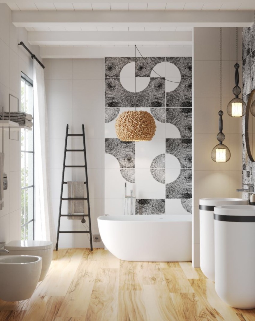 Еще один интересный ход – даже в небольшом пространстве визуально выделять разные зоны. С этой функцией отлично справляется плитка. Времена, когда всю ванную комнату “закатывали” в один вид отделки, давно прошли. Нам открыто широкое поле для экспериментов!