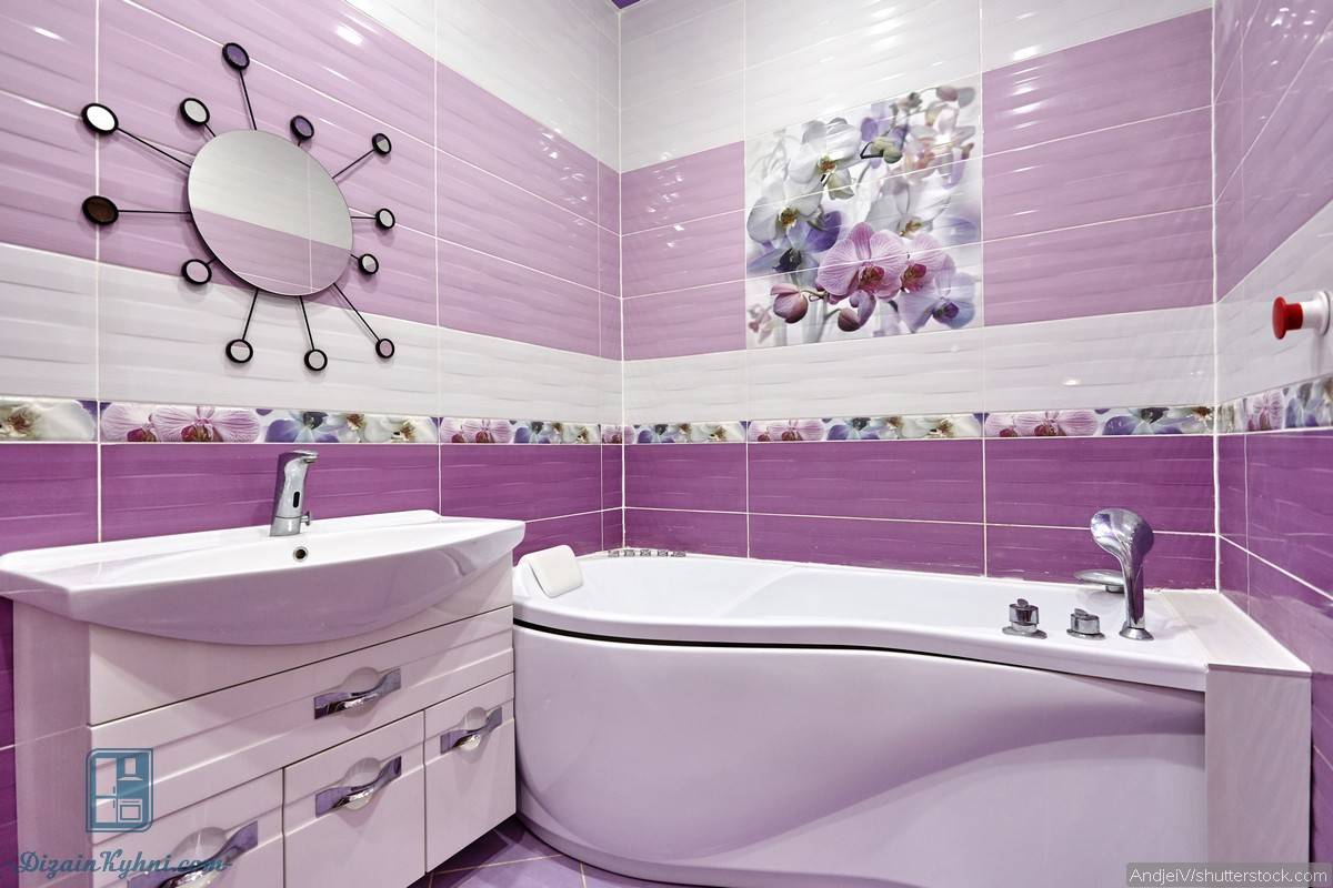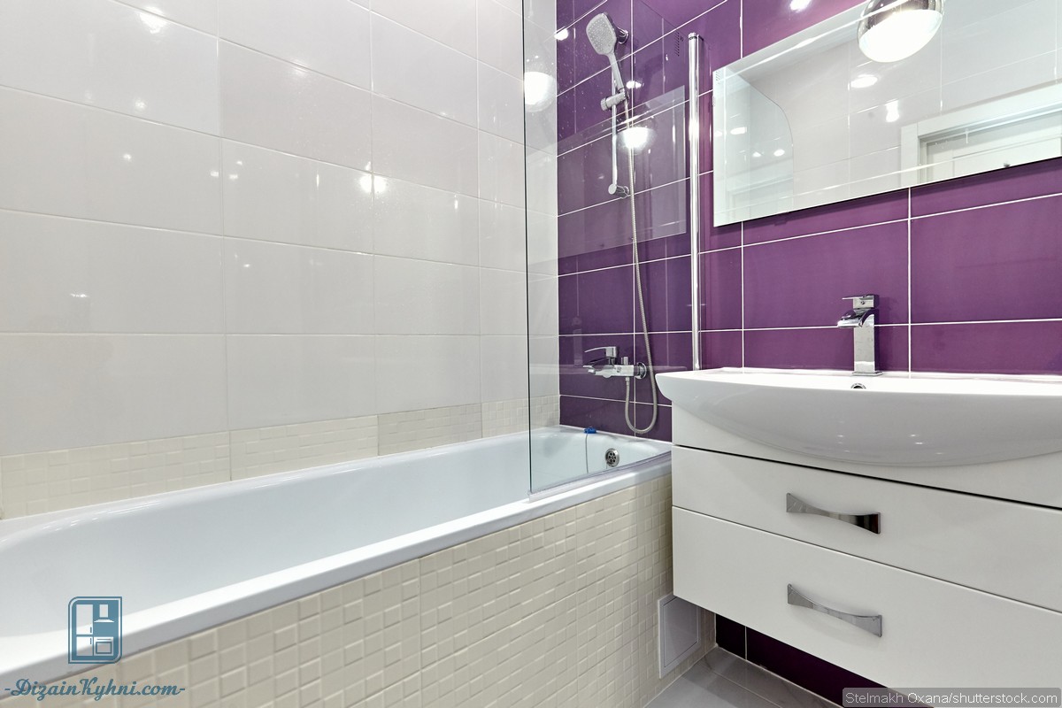 Чтобы с помощью материала визуально расширить маленькое пространство, желательно приобретать изделие светлого оттенка. Интересным решением для такого помещения станет облицовка стен фиолетовой, зеленой, бирюзовой или желтой плиткой. Нежелательно устанавливать плитку больших размеров, так как в современном интерьере огромным спросом пользуется керамическая и стеклянная мозаика. Хорошим решением для дизайна ванны станет и отделка стен ПВХ-панелями или обоями, при этом нужно выбирать влагоустойчивый материал с минимальным наличием узоров и рисунков.