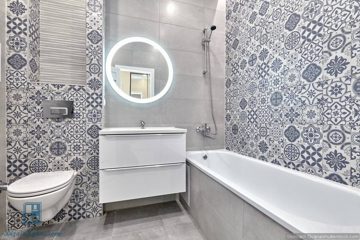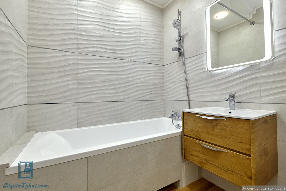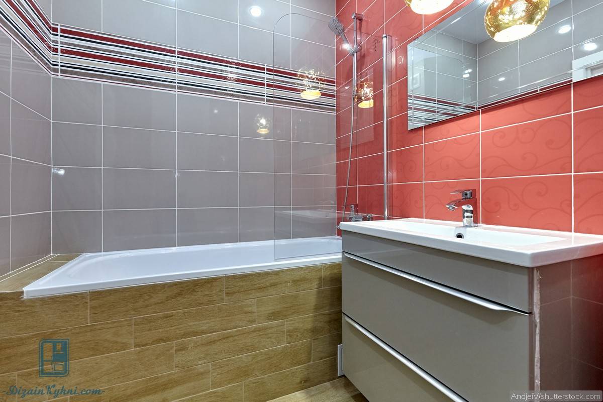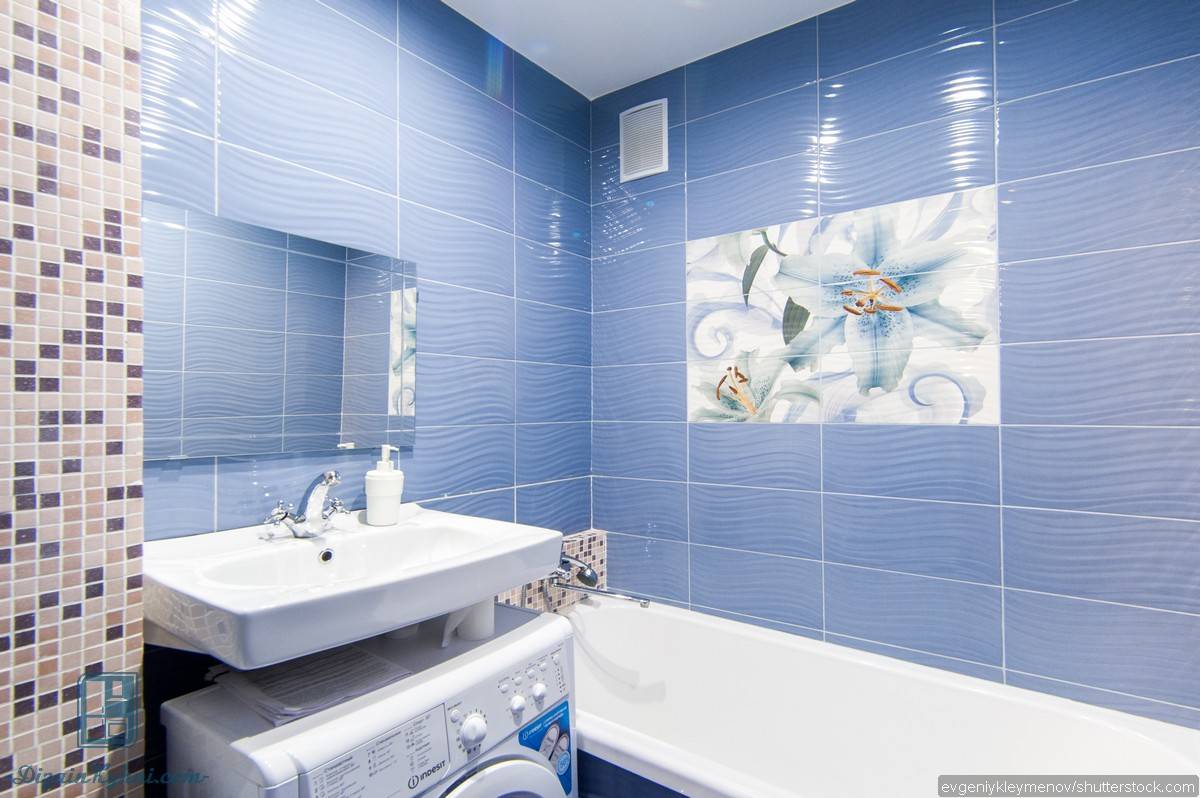 - керамическая плитка. Сегодня можно приобрести настенную плитку стандартных и уникальных размеров. Если не хочется переплачивать за оригинальность, можно предпочесть привычные для отечественного покупателя модели 30*30, 30*40, 30*60. Однако, при выборе этого отделочного материала для стен ванной 5, 6 или 7 кв м стоит выбирать кафель меньшего размера. Отметим, что более крупные плитки имеют большую толщину и крепятся на более существенный объем клея. В крохотной комнатке это неприемлемо, так как толстый слой отделки на стенах несколько уменьшит свободное пространство помещения.