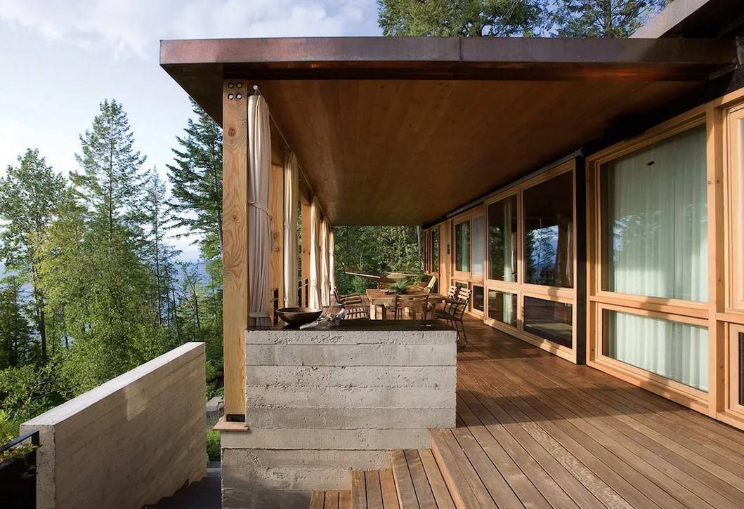 Если вас не радуют все традиционные стили, можно попробовать оформить веранду в современном. Из тех же материалов и мебели, но в другом сочетании и компоновке можно получить совсем другой интерьер. Например, опорные колонны можно сделать, как на фото ниже, расставить низкую современную мебель. Ограждение — того же стиля (как на фотографии), возможный вариант — из закаленного стекла или поликарбоната.