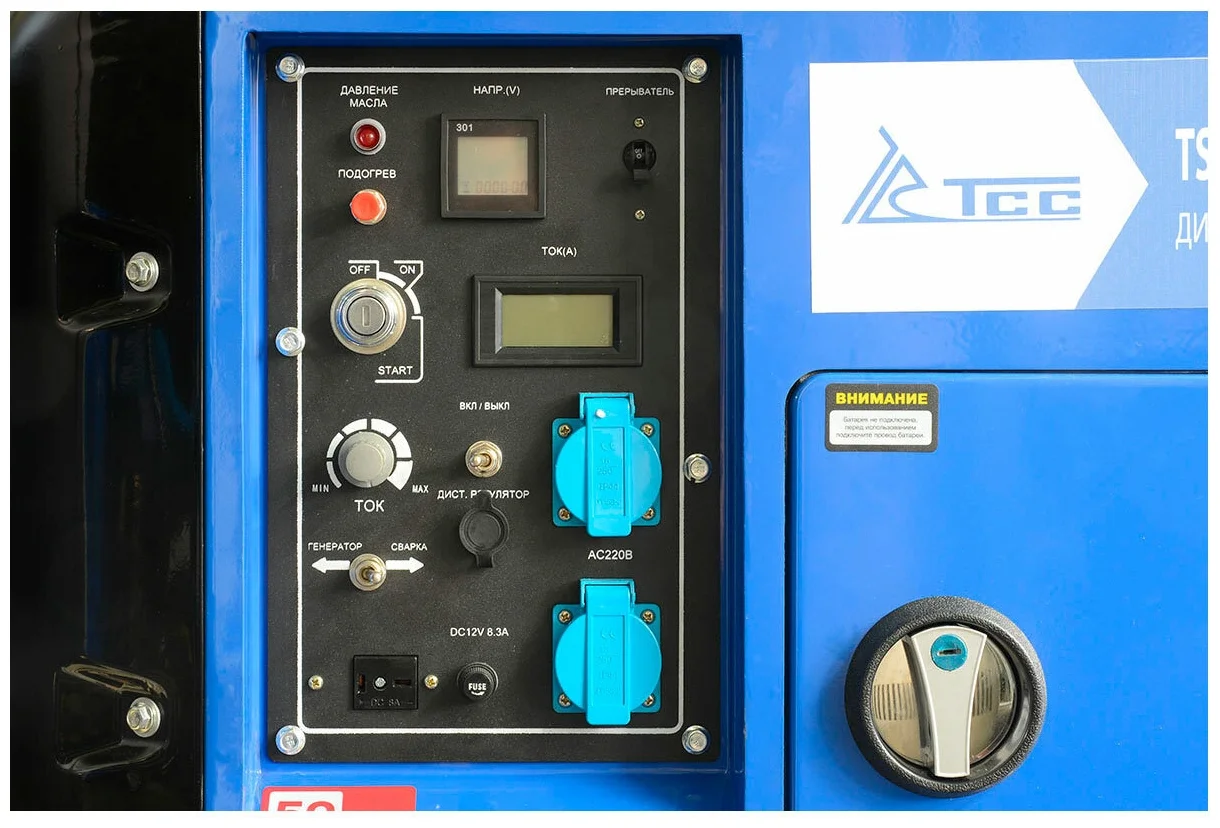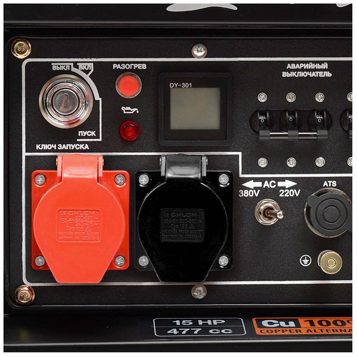 Стабильно работает на 6-6,5кВт и на одной и на трех фазах. На панели 2-ве розетки 220x16A + в комплекте классный удлинитель с 4-мя розетками 220 по 16А. Детали все качественные. Запуск и работа нормальная.