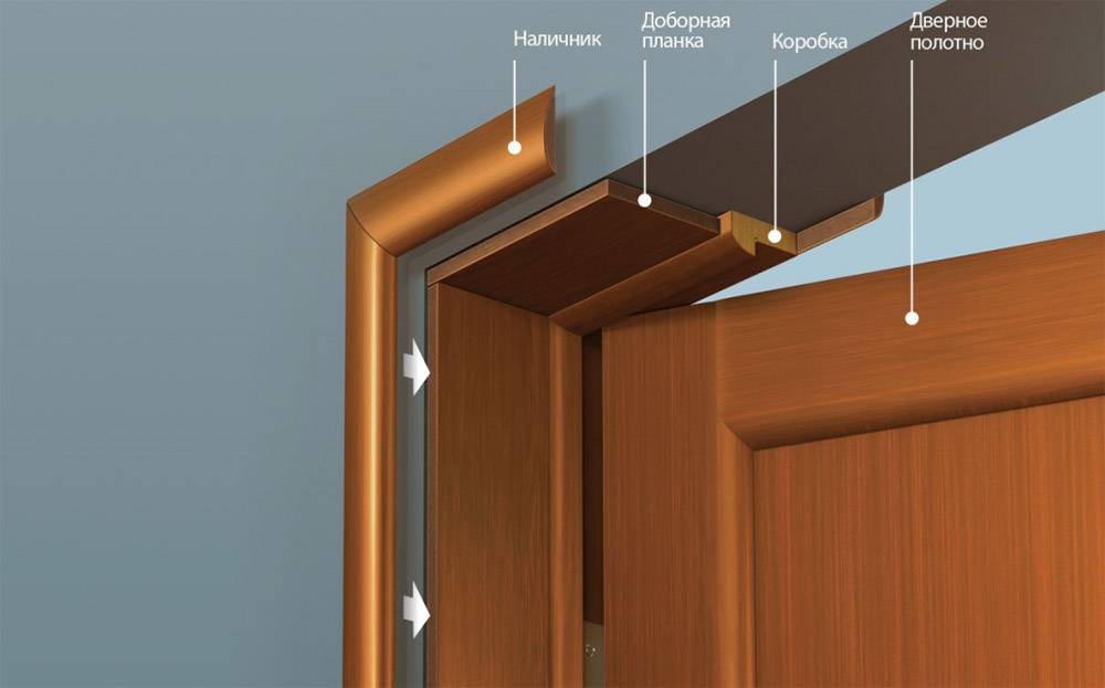 Доборы — это элементы обрамления откосов, которые дают возможность обходиться без выравнивания штукатуркой и составляют единый ансамбль с дверьми и наличниками. Если толщина стены внутри проёма превышает толщину установочного короба, то оставшаяся открытая плоскость оформляется доборами, которые представляют собой прямые продолговатые планки.